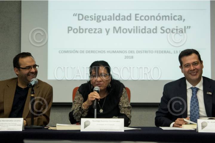CIUDAD DE MÉXICO, 13MARZO2018.- Gonzálo Hernández Licona, secretario Ejecutivo del Consejo Nacional de Evaluación del Desarrollo Social (CONEVAL), Nasheli Ramírez Hernández, presidente la Comisión de Derechos Humano del Distrito Federal (CDHDF), y José Ramón Amieva Gálvez, secretario de Gobierno de la Ciudad de México, durante la presentación del libro “Desigualdad Económica, Pobreza y Movilidad Social” en la sede de la CDHDF. FOTO: GALO CAÑAS /CUARTOSCURO.COM