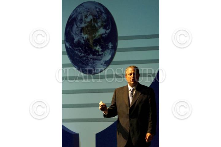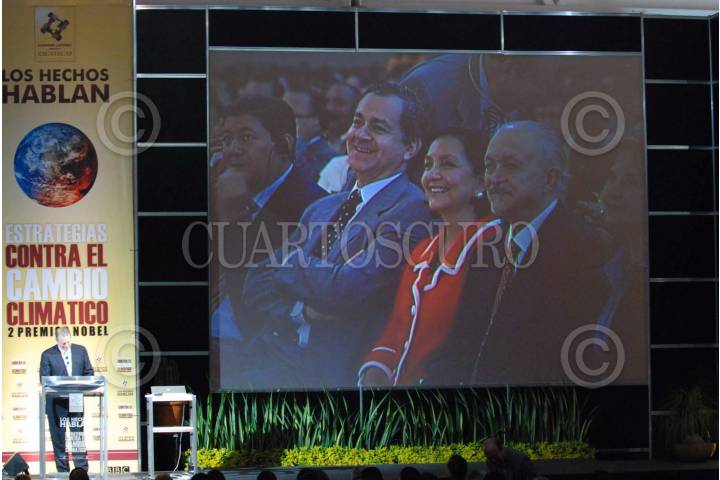 ZACATECAS, ZACATECAS, 28SEPTIEMBRE2009.- Al Gore, ex vicepresidente de los Estados Unidos, durante su conferencia "Una Verdad Incómoda", que forma parte del foro "Estrategias contra el Cambio Climático", que se efectua en el Palacio de Convenciones de esta ciudad. Estuvieron presentes Juan Rafael Elvira Quezada, Secretario de la Secretaría de Medio Ambiente y Recursos Naturales (Semarnat), Amalia García Medina, gobernadora del estado y Mario Molina, Premio Nobel de Química. FOTO: CARLOS SEGURA/CUARTOSCURO.COM
