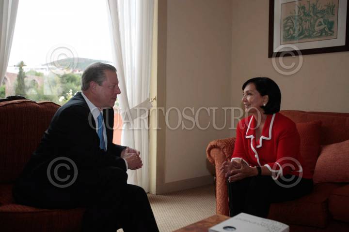 ZACATECAS, ZACATECAS, 28SEPTIEMBRE2009.- Al Gore, ex vicepresidente de los Estados Unidos, se reunió esta tarde con Amalia García Medina, gobernadora del estado, para tratar diversos asuntos relacionados con el cambio climático, esto despues de participar en el foro "Estrategias contra el Cambio Climático", que se efectuo en el Palacio de Convenciones de esta ciudad. FOTO: CUARTOSCURO.COM