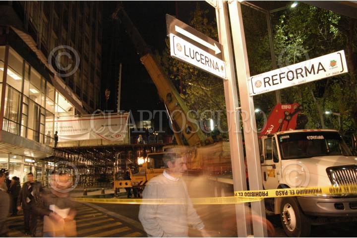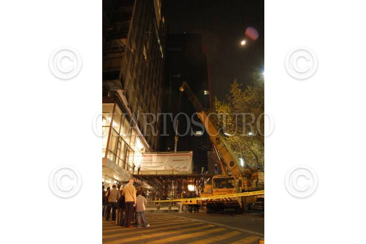 MÉXICO, D.F. 11DICIEMBRE2005.- Trabajadores revisan el mural de Juan O´Gorman después de que la grúa sufriera un percance durante la operación de traslado hacia la esquina de Tíber y Reforma. FOTO:Miriam Sánchez/CUARTOSCURO.COM