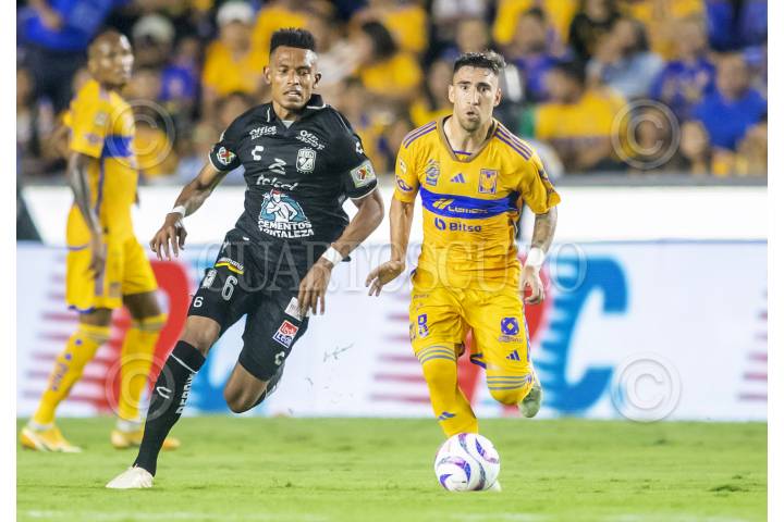 Fernando Gorriarán de Tigres, se disputa el balón con Willam Tesillo de León, en el estadio Universitario, partido correspondiente a la jornada 3 de la Apertura 2023.