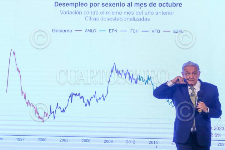CIUDAD DE MÉXICO, 15ENERO2025.- Andrés Manuel López Obrador, Presidente de México, muestra una gráfica del desempleo por sexenio en el mes de octubre, durante la mañanera. FOTO: MOISÉS PABLO/CUARTOSCURO.COM