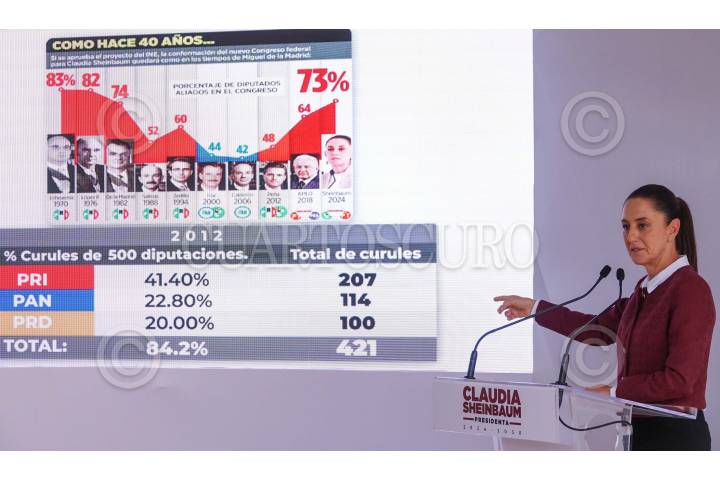 CIUDAD DE MÉXICO, 22AGOSTO2024.- Claudia Sheinbaum, virtual presidenta electa, mostró una lamina que muestra el porcentaje de diputados aliados en el Congreso en diferentes sexenios, durante su conferencia de prensa en la Casa de Transición, ubicada en la alcaldía Iztapalapa. FOTO: GRACIELA LÓPEZ /CUARTOSCURO.COM