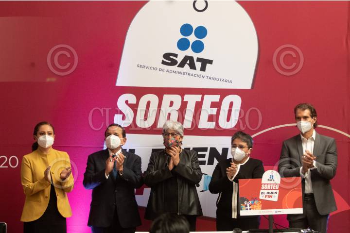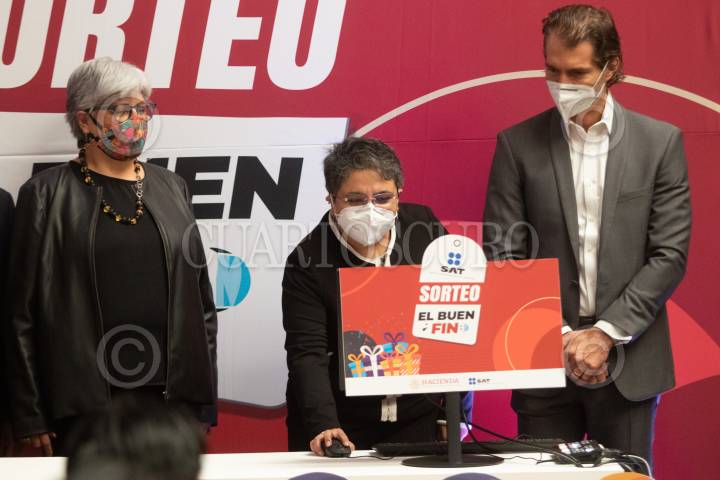 José Manuel Campos, líder de la Concanaco-Servitur, Graciela Márquez Colín, secretaria de Economía, y Raquel Buenrostro, titular del SAT, durante el Sorteo de El Buen, el cual repartió una bolsa de 500 millones de pesos, los ganadores fueron todos aquellos que realizaron compras a partir de 250 pesos con tarjetas bancarias en los días del 9 al 20 de noviembre de este año.