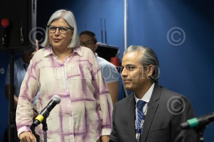 CIUDAD DE MÉXICO, 01ABRIL2025.- Enrique Quintana y Graciela Márquez Colín, directora del INEGI, durante su participación en la mesa de análisis por los 10 años de México Cómo Vamos, quien se ha dedicado a lo largo de su historia a analizar los datos estadísticos en los temas económicos y sociales del país. FOTO: MOISÉS PABLO/CUARTOSCURO.COM
