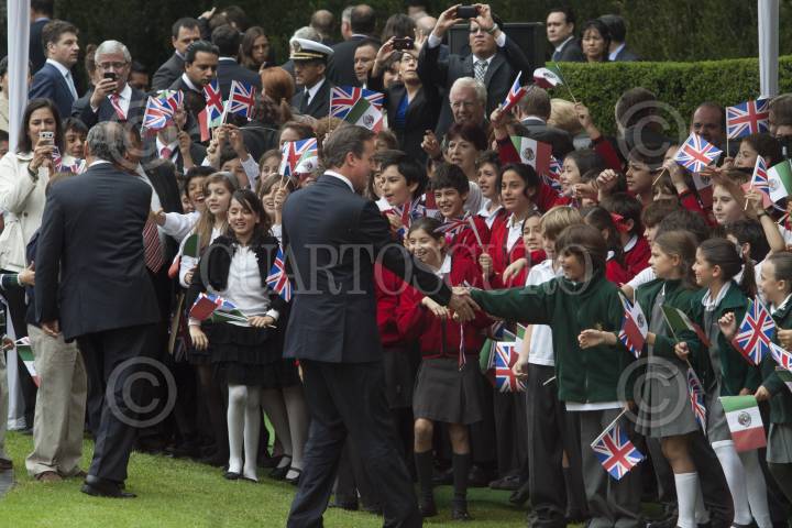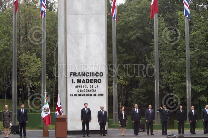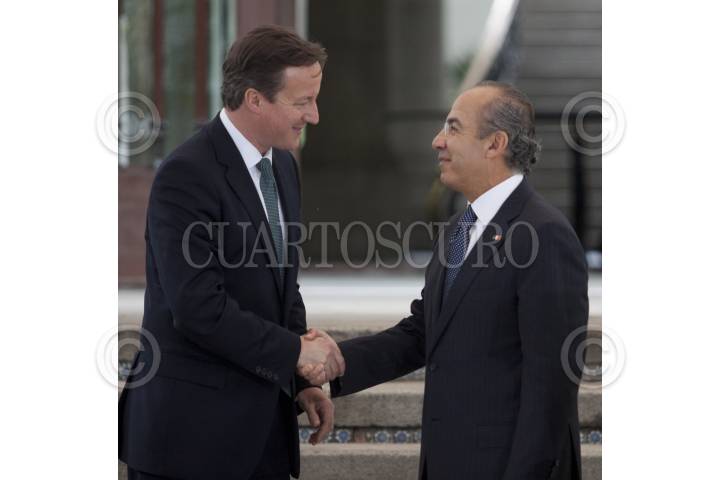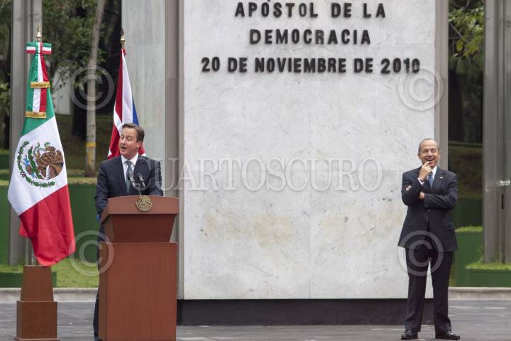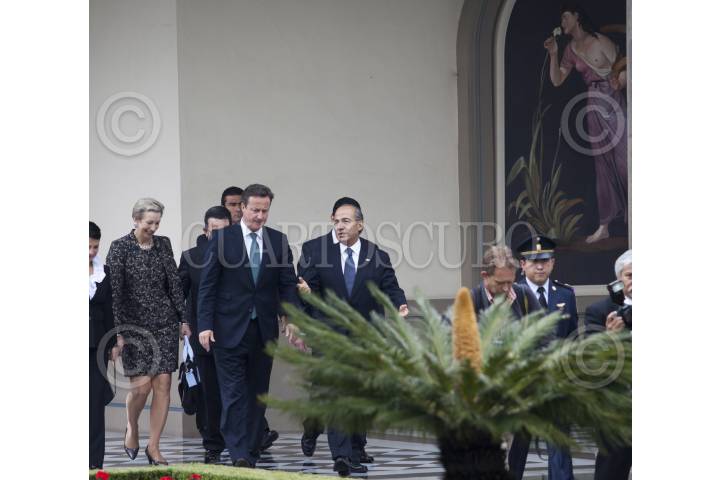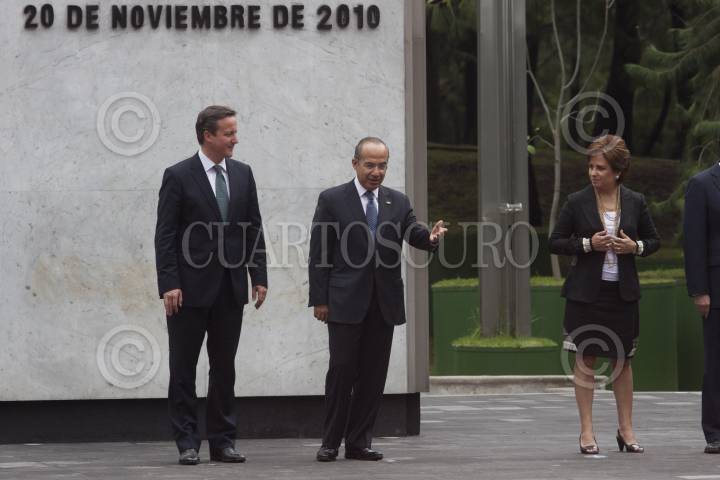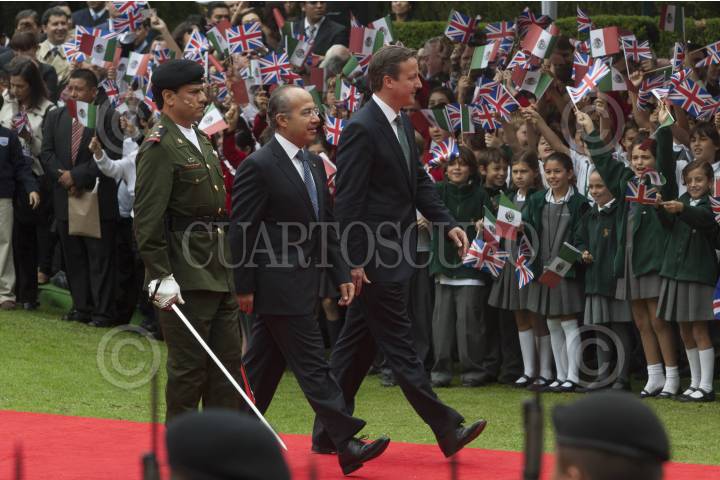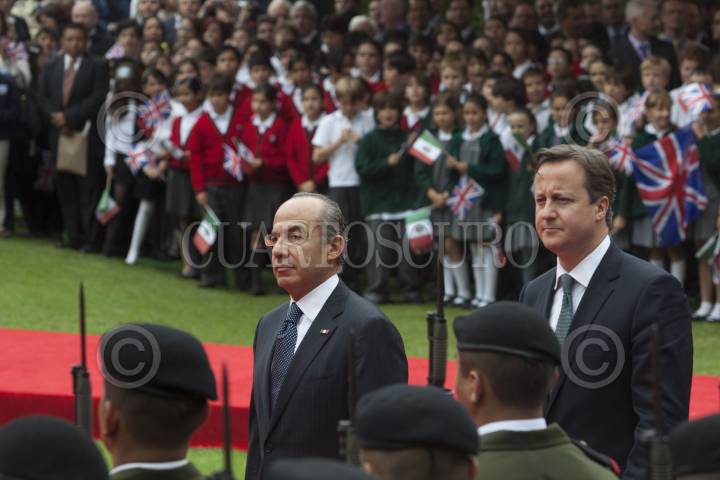 MÉXICO, D.F., 20JUNIO2012.- David Cameron, Primer Ministro de la Gran Bretaña e Irlanda del Norte, fue recibido en ceremonia de estado encabezada por el Jefe del Ejecutivo Felipe Calderón Hinojosa, en Monumento a Francisco I. Madero de la residencia oficial de Los Pinos. FOTO: MOISÉS PABLO /CUARTOSCURO.COM