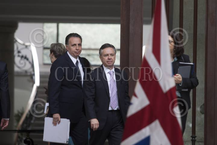 MÉXICO, D.F., 20JUNIO2012.- Bruno Ferrari, secretario de Economía y Eduardo Medina Mora, diplomático mexicano en la Gran Bretaña, llegan a las escalinatas de la residencia Miguel Alemán Valdés, de Los Pinos. Ahí se recibió a el Primer Ministro de la Gran Bretaña e Irlanda del Norte David Cameron. FOTO: MOISÉS PABLO /CUARTOSCURO.COM