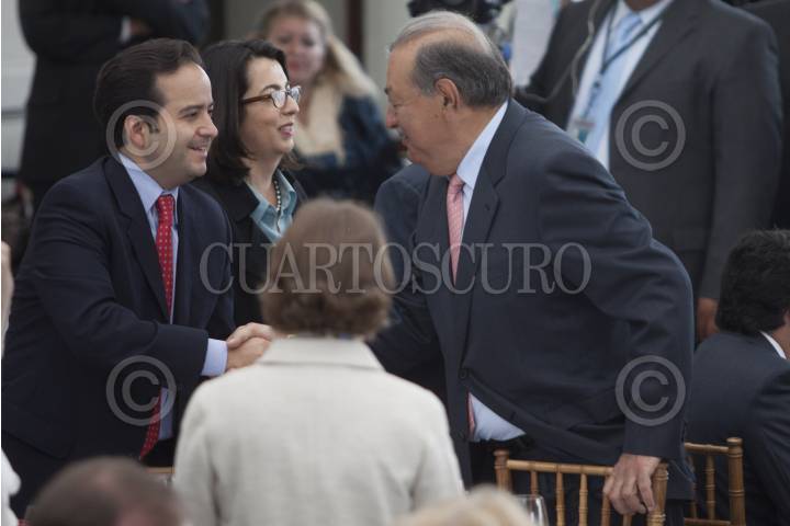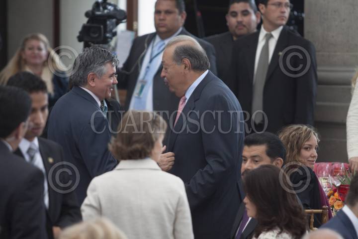 MÉXICO, D.F., 20JUNIO2012.- Alejandro Poiré, secretario de Gobernación y Carlos Slim Helú, fundador del grupo Carso, durante la comida que se ofreció en honor a el Primer Ministro de la Gran Bretaña David Cameron en el Alcázar del Castillo de Chapultépec. FOTO: MOISÉS PABLO /CUARTOSCURO.COM