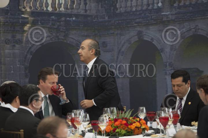 MÉXICO, D.F., 20JUNIO2012.- David Cameron, Primer Ministro de la Gran Bretaña e Irlanda del Norte, y Felipe Calderón Hinojosa, Presidente de México, brindan en la comida en en el Álcazar del Castillo de Chapultépec, en donde fortalecieron las relaciones entre ambos países. FOTO: MOISÉS PABLO /CUARTOSCURO.COM
