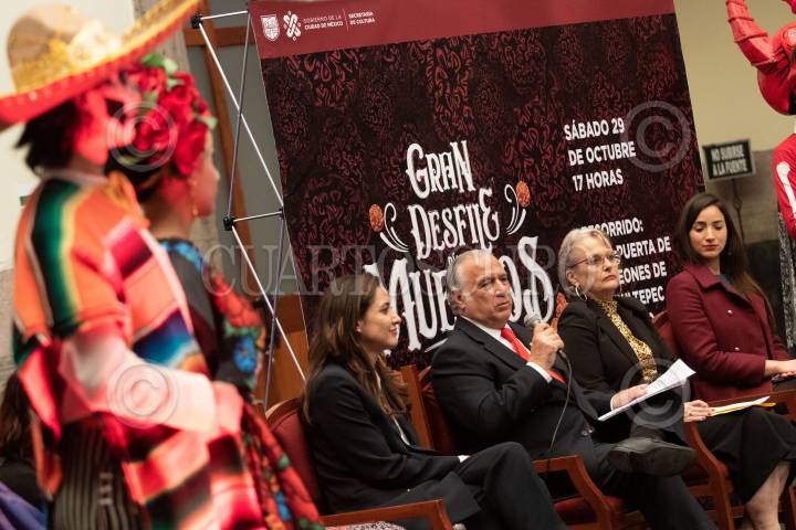Claudia Curiel, Miguel Torruco, y Nathalie Desplas, dieron detalles del Gran Desfile Día de Muertos que se celebrará el próximo sábado en avenida Reforma.
