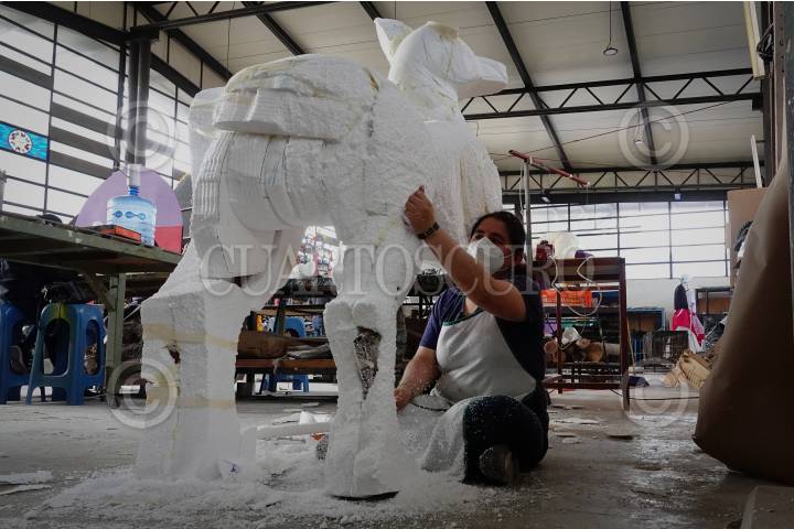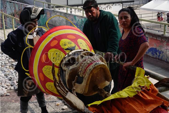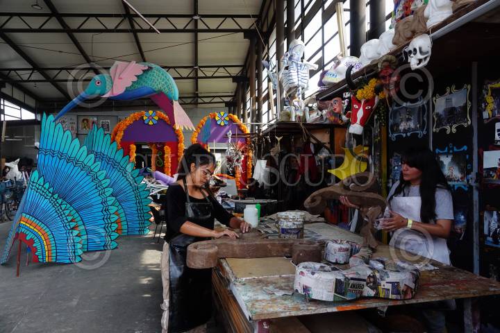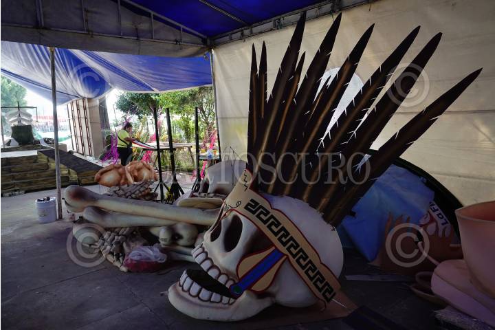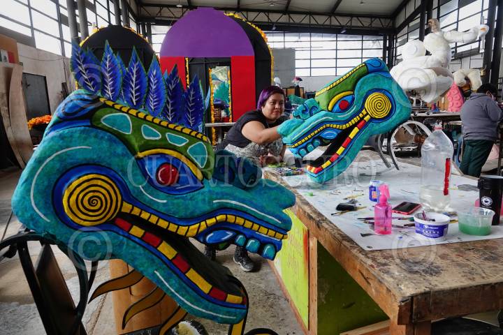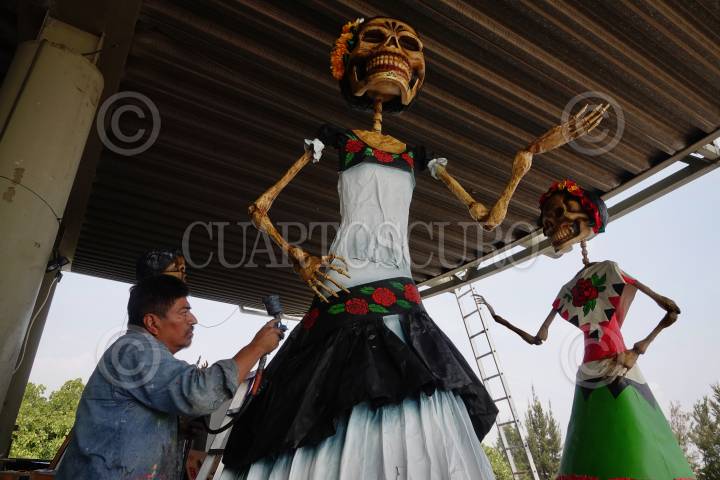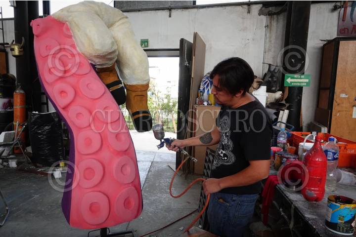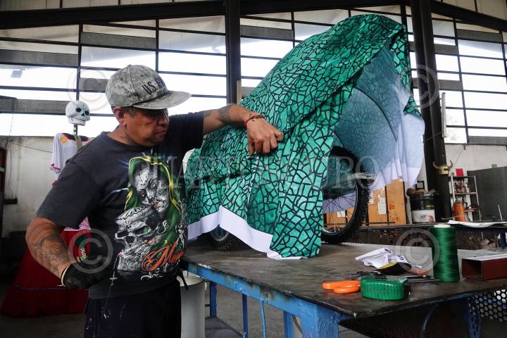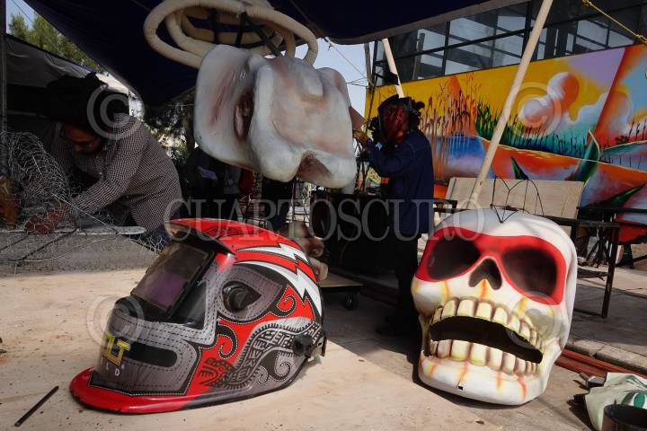 Artistas trabajan a marchas forzadas desde el Faro Oriente en los preparativos para el Gran Desfile día de Muertos.