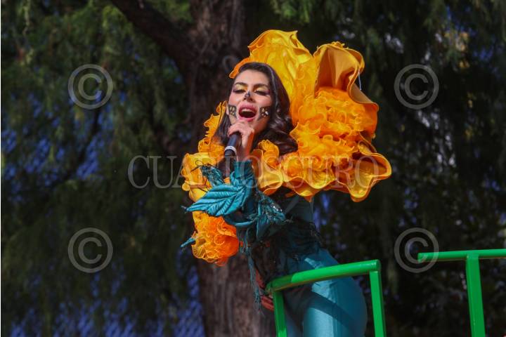 Casi un millón de espectadores se registraron en el Gran Desfile de Día de Muertos, que partió del Zócalo rumbo a Campo Marte. En la imagen Regina Orozco durante el recorrido.