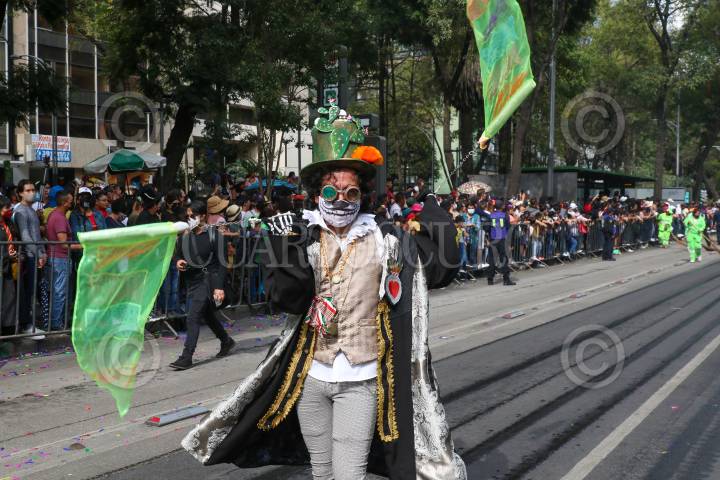 Casi un millón de espectadores se registraron en el Gran Desfile de Día de Muertos, que partió del Zócalo rumbo a Campo Marte. En la imagen Albertano, que es interpretado Ariel Miramontes, durante el recorrido.