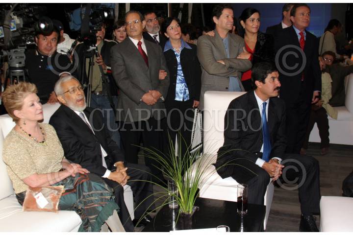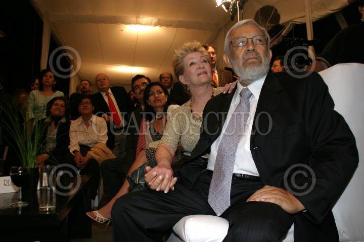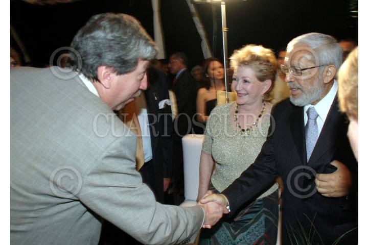 MÉXICO, D.F., 10AGOSTO2007.- El vicepresidente de El Universal Roberto Rock, saluda a Miguel Angel Grandos Chapa y Shulamit Goldsmit, esposa del periodista, durante el festejo con motivo de la publicación de la columna de Granados Chapa "Plaza Pública, en la Casa del Lago. FOTO: MOISÉS PABLO/CUARTOSCURO.COM