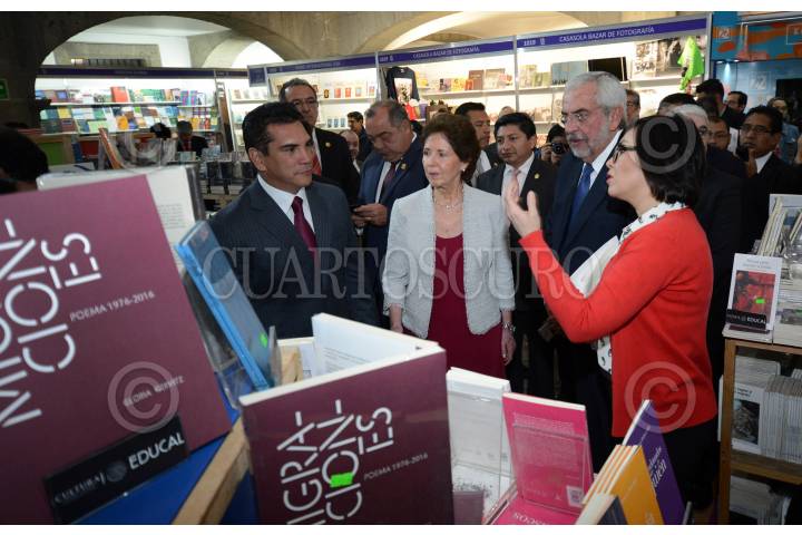 CIUDAD DE MÉXICO, 22FEBRERO2018.- Alejandro Moreno, gobernador de Campeche, María Cristina García Cepeda, secretaria de Cultura, y Enrique Graue, rector de la UNAM, durante un recorrido por la recien inaugurada Feria Internacional del Libro de Palacio de Minería. FOTO: UNAM /CUARTOSCURO.COM
