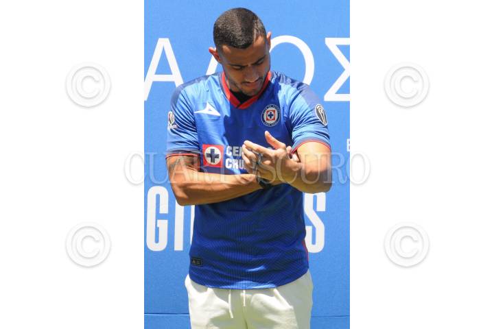 CIUDAD DE MÉXICO, 17JUNIO2024. - El nuevo delantero de Cruz Azul, Giorgos Giakoumakis, se vistió con la playera de Cruz Azul en su presentación. FOTO: DANIEL AUGUSTO / CUARTOSCURO.COM
