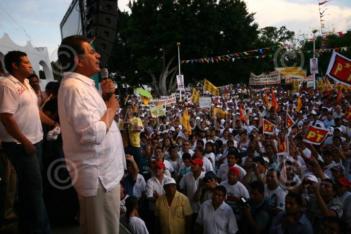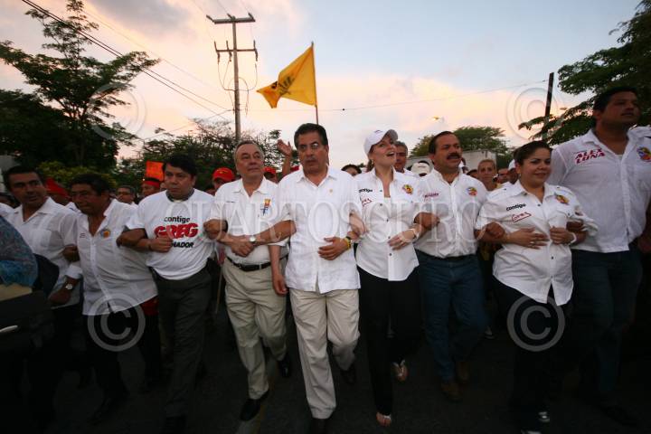 CANCUN, QUINTANA ROO, 30MAYO2010.- Jesús Ortega, líder nacional del PRD, acompañado de Niurka Saliva, esposa del candidato del PRD a la gubernatura del Estado Greg Sanchez detenido por presuntos nexos con el narcotrafico, durante un mitin de apoyo en la plaza de la reforma en esta ciudad. FOTO: AMARANTA PRIETO/CUARTOSCURO.COM