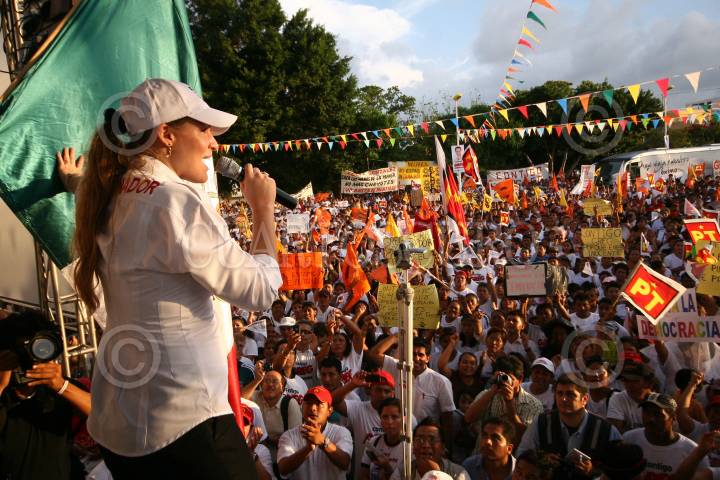 CANCUN, QUINTANA ROO, 30MAYO2010.- Niurka Saliva, esposa del candidato del PRD a la gubernatura del Estado Greg Sanchez detenido por presuntos nexos con el narcotrafico, durante un mitin de apoyo en la plaza de la reforma en esta ciudad. FOTO: AMARANTA PRIETO/CUARTOSCURO.COM