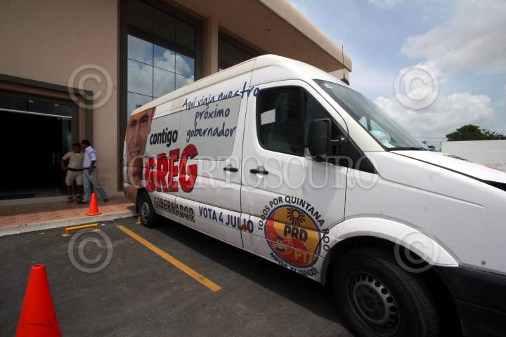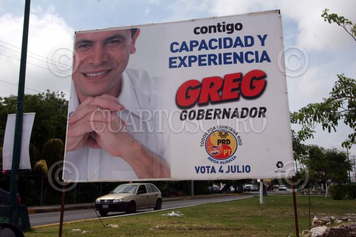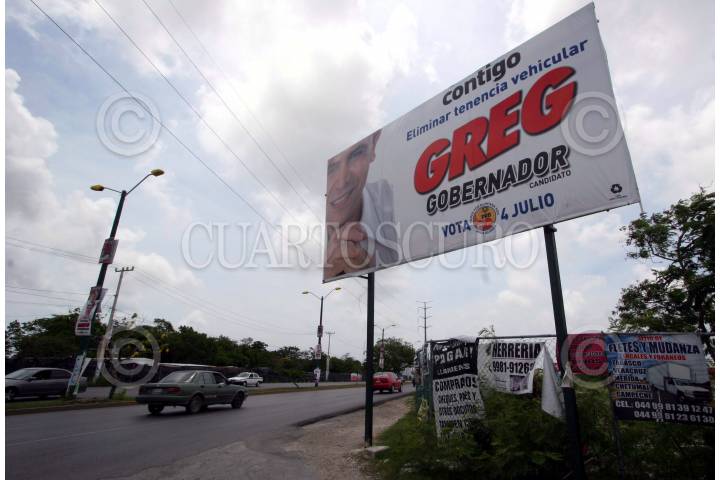 CANCÚN, QUINTANA ROO, 01JUNIO2010.- Gregorio "Greg" Sánchez Martínez, fue declarado formalmente preso por un juez federal de Nayarit, al encontrarse pruebas suficientes de su presunta responsabilidad en los delitos de "lavado" de dinero, delincuencia organizada y narcotráfico. El juzgado segundo de distrito de procesos penales federales resolvió que hay evidencias suficientes para someter a proceso penal a "Greg", quien no tendrá el beneficio de la libertad provisional y se le suspenderán sus derechos políticos. En la imagen, aspectos de propaganda electoral. FOTO: AMARANTA PRIETO/CUARTOSCURO.COM