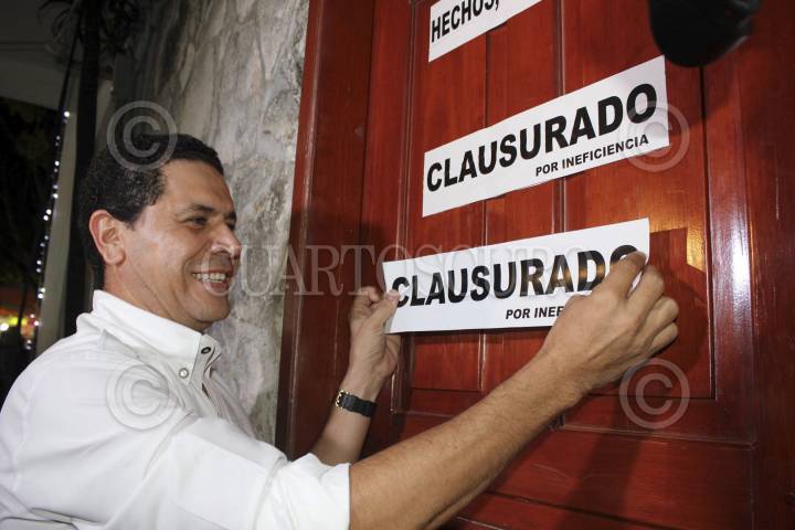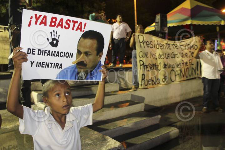 CANCÚN, QUINTANA ROO, 12DICIEMBRE2012.- El ex Alcalde de Cancún, Gregorio Sánchez Mártínez, detenido en 2010 por presuntos vínculos con la delincuencia organizada y con un expediente abierto en la Procuraduría General de Justicia de Quintana Roo por el supuesto desvío de recursos públicos, se presentó la tarde de este miércoles en la Plaza de la Reforma y clausuró de forma simbólica el Palacio Municipal de Cancún en medio de reclamos para que el actual Alcalde, Julián Ricalde Magaña. Acompañado por decenas de seguidores que gritaron consignas y enarbolaron mantas contra Ricalde, en lo que se pretendió fuera un “Tribunal del Pueblo”, Sánchez Martínez rechazó haber robado dinero del Ayuntamiento. FOTO: CSPHOTO /CUARTOSCURO.COM