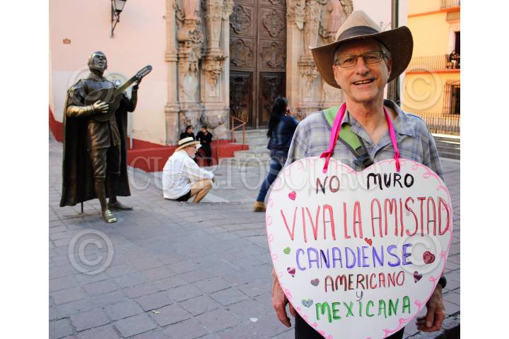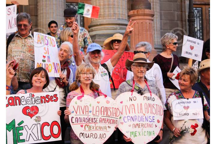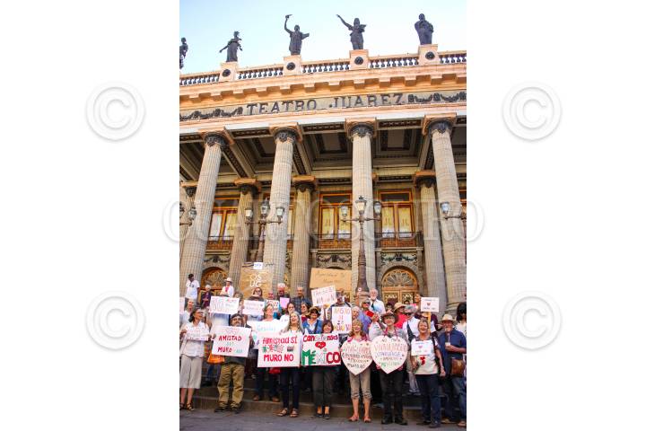 GUANAJUATO, GUANAJUATO, 14FEBRERO2017.- Norteamericanos residentes y turistas extranjeros realizaron una marcha que culminó en el Teatro Juárez para mostrar su amistad con los mexicanos y oponerse a la construcción del muro que planea Donald Trump, presidente de Estados Unidos. FOTO: GUSTAVO BECERRA /CUARTOSCURO.COM