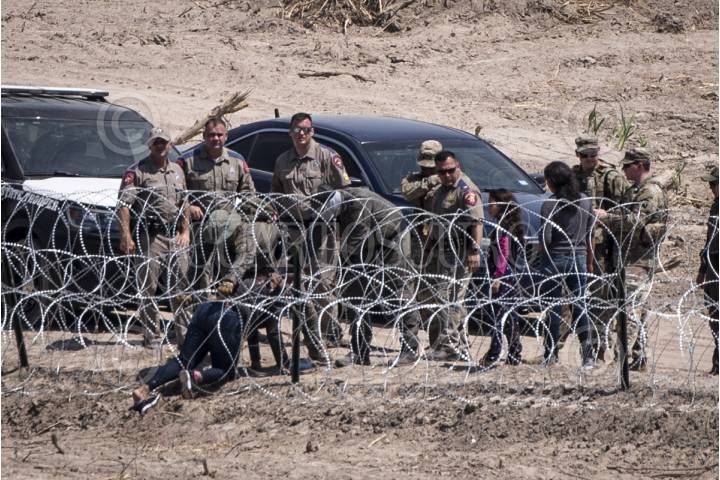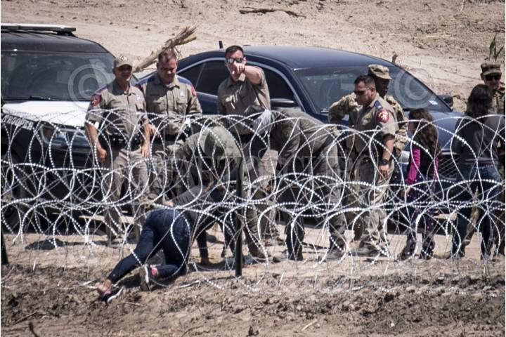 Esperanzados tres escuchar testimonios y rumores de que las autoridades federales estadounidense están recibiendo y otorgando asilo a migrantes, un grupo de mujeres de origen venezolano, tras cruzar el río, se entregan a la guardia fronteriza atravesando un alambre de púas.