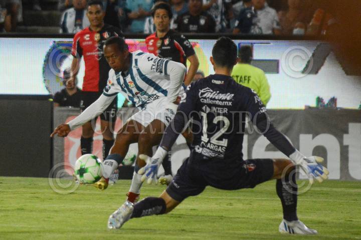 Romario Ibarra, mediocampista del Pachuca remata el balón para anotar frente al Atlas, en partido de vuelta de la final de la Liga Grita México C22 de la Liga BBVA MX.