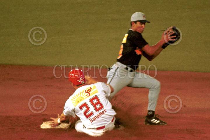 Kevin Griyak de los Diablos de México se barre en segunda base, mientras el segunda base de los Tigres evita el golpe. Hasta la 7ma entrada los Diablos y los Tigres empataban a 4-4 carreras. FOTO: David Bolaños/CUARTOSCURO.COM