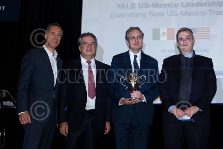 CIUDAD DE MÉXICO, 21FEBRERO2017.- Arne Sorenson, director general de Marriot; Jaime Chico Pardo, director general de Enessa; Daniel Servitje, nuevo presidente y director ejecutivo de Grupo Bimbo, y Juan Domingo Beckman, director general de José Cuervo, entregaron el reconocimiento por parte de la Universidad de Yale a Daniel Servitje, con motivo del primer Foro de Directores Ejecutivos de Estados Unidos y México sobre comercio bilateral. FOTO: GALO CAÑAS /CUARTOSCURO.COM