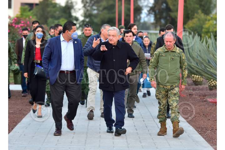 Diego Sinhue, gobernador de Guanajuato; Andrés Manuel López Obrador, Presidente de México, y José Rafael Ojeda Durán, secretario de Marina, durante la mañanera en Irapuato.