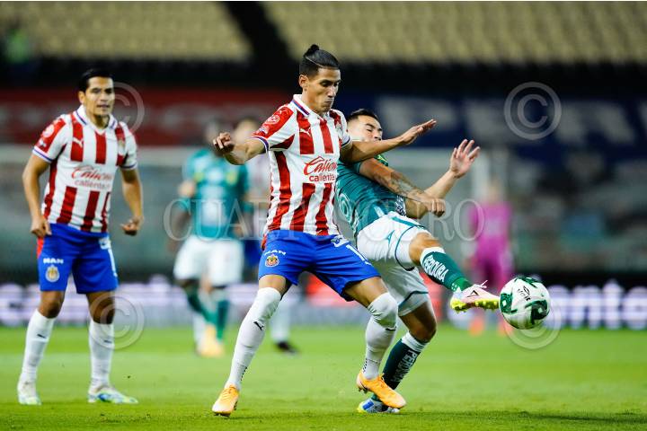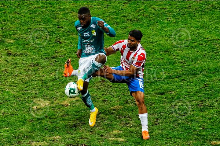 Cristian "Chicote" Calderón (Chivas) disputa un balón ante un jugador de León, durante su primer partido de Semifinales del torneo Guard1anes.