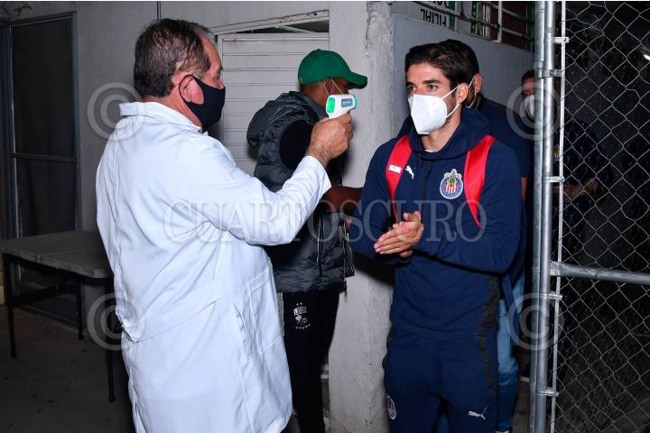 Equipo médico le toma la temperatura a integrantes de las Chivas del Guadalajara durante su acceso al Estadio León. En la imagen Isaac Brizuela. FOTO: IMAGO 7/LIGA MX