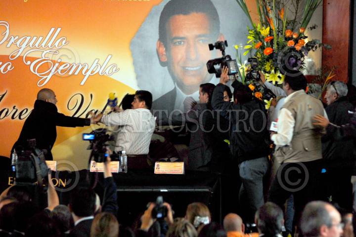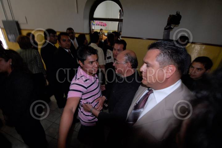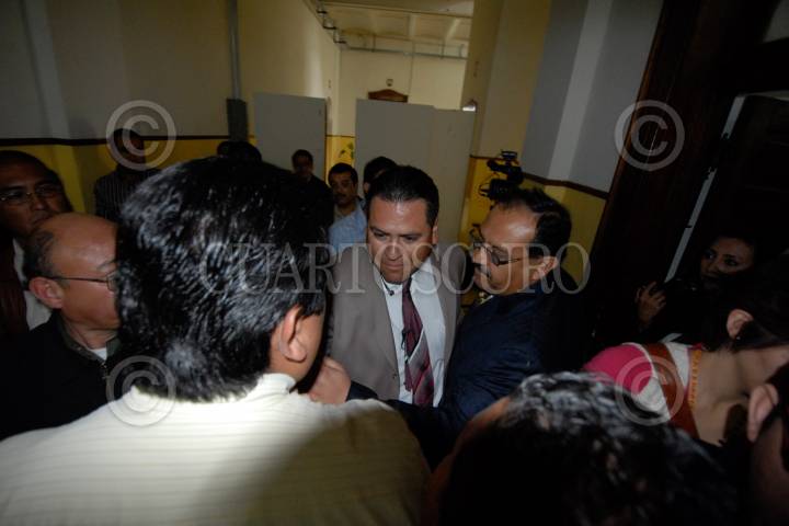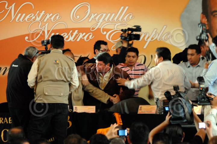 SALTILLO, COAHUILA, 10MARZO2010.- Durante una conferencia en la cual asistió Humberto Moreira Valdés, Gobernador del estado, el pasado lunes, un grupo de guardaespaldas del mandatario, impidió hacer la labor informativa a reporteros, camarografos y fotógrafos por lo que se desato un altercado en el que un guardaespaldas apunto con un arma de fuego a los comunicadores registrando varios heridos por golpes.. FOTO: DANIEL BECERRIL/PERIODICO VANGUARDIA/CUARTOSCURO.COM