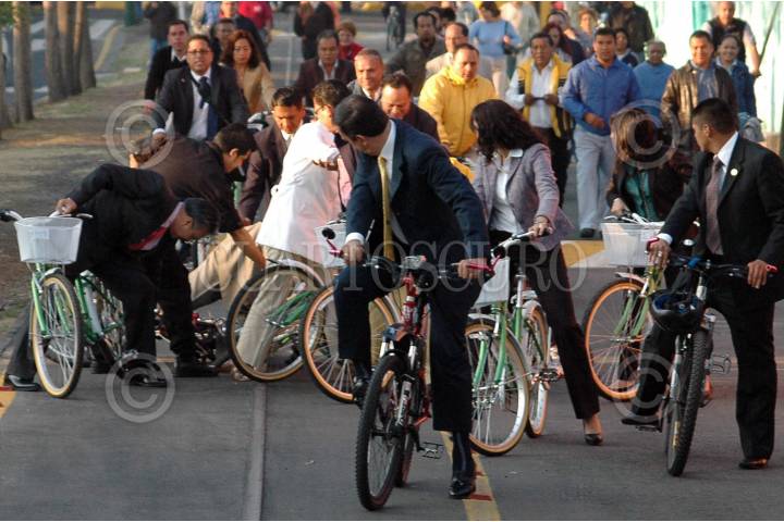 MÉXICO, D.F., 16ABRIL2010.- Un elemento de seguridad del jefe de Gobierno capitalino cayó de su bicicleta y ocasionó que la titular del Medio Ambiente local, Martha Delgado, perdiera el equilibrio, durante la inauguración de la primera ciclovía de Azcapotzalco. FOTO: ESPECIAL/CUARTOSCURO.COM