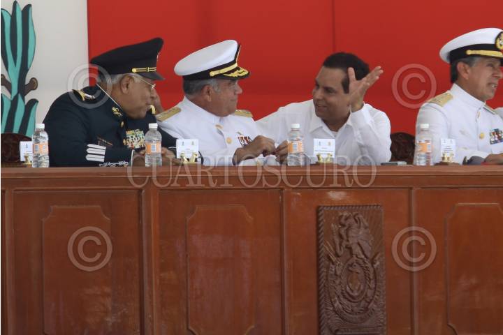 ANTÓN LIZARDO, VERACRUZ, 30JULIO2010.- El general Guillermo Galvan, secretario de la Defensa Nacional; el Almirante Francisco Saynez, secretario de Marina y Fidel Herrera, gobernador del estado durante la ceremonia de graduación de 92 Guardiamarinas de la Heroica Escuela Naval Miliar de la generación 2005 - 2010. FOTO: RODOLFO ANGULO/CUARTOSCURO.COM