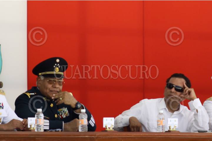 ANTÓN LIZARDO, VERACRUZ, 30JULIO2010.- El general Guillermo Galvan, secretario de la Defensa Nacional y Fidel Herrera, gobernador del estado durante la ceremonia de graduación de 92 Guardiamarinas de la Heroica Escuela Naval Miliar de la generación 2005 - 2010. FOTO: RODOLFO ANGULO/CUARTOSCURO.COM