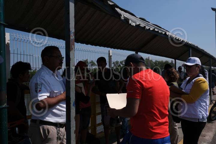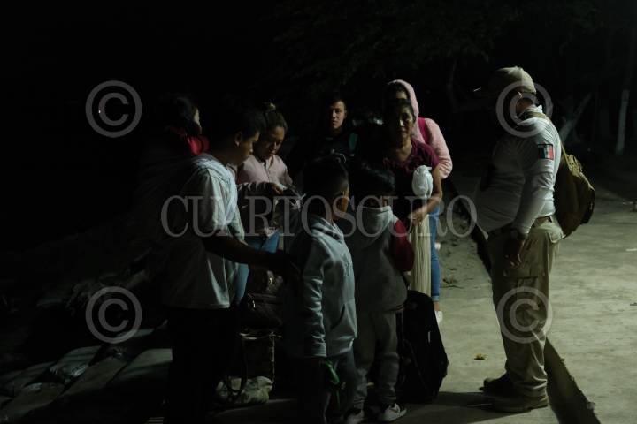 Agente Migratorio solicita documentos a una familia proveniente de Guatemala, al momento de arribar a territorio mexicano.