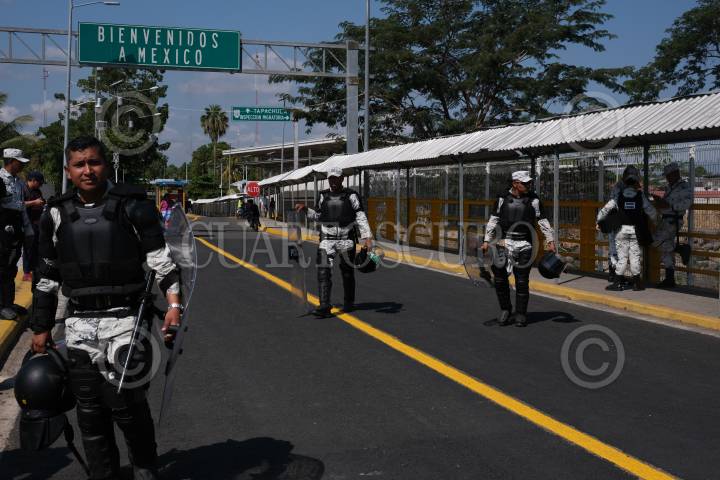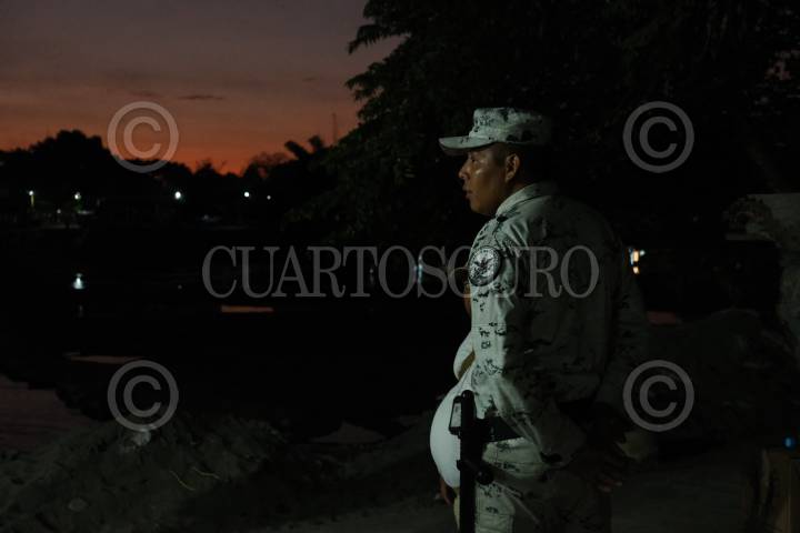 Elementos de la Guardia Nacional mantienen un operativo a lo largo de la orilla de Río Suchiate.