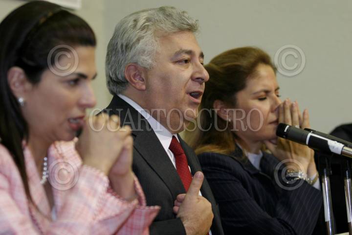 México, D. F. 16 Marzo 2004.- Emilio Chuayffet Chemor, coordinador de la fracción parlamentaria del PRI en la cámara de diputados, acompañado por las diputadas Marcela Guerra y María Esther Sherman ofreció una conferencia de prensa donde dijó que la licencia de Elba Esther Gordillo Morales a la diputación federal restituye la legalidad estatutaria en el PRI. FOTO: Nelly Salas/CUARTOSCURO.COM