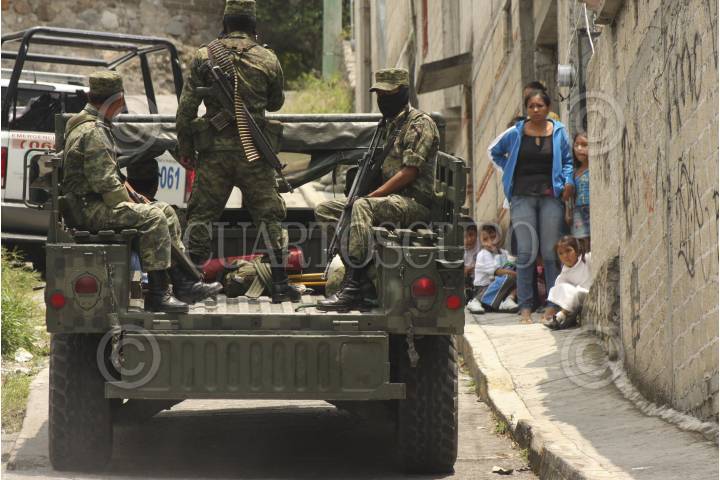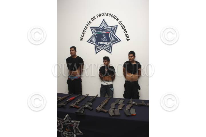 TEMIXCO, MORELOS, 28AGOSTO2012.- Tras un intento fallido secuestro se detuvo en una casa de seguridad a tres individuos pertenecientes a la agrupación llamada “Guerreros Unidos”, en el operativo intervino la policía municipal, la policía Federal y el ejército mexicano que contó con la presencia en el lugar de los hechos del nuevo general de la 24 zona militar; Édgar Luis Villegas Meléndez. En el domicilio ubicado en la colonia Lázaro Cárdenas en la calle Ávila Camacho se decomisaron 5 armas largas y dos cortas. Trascendió de manera extraoficial que los detenidos han participado en por lo menos 40 plagios, los cuales en su mayoría culminaron en ejecuciones. FOTO: ALMA LAFAYET /CUARTOSCURO.COM