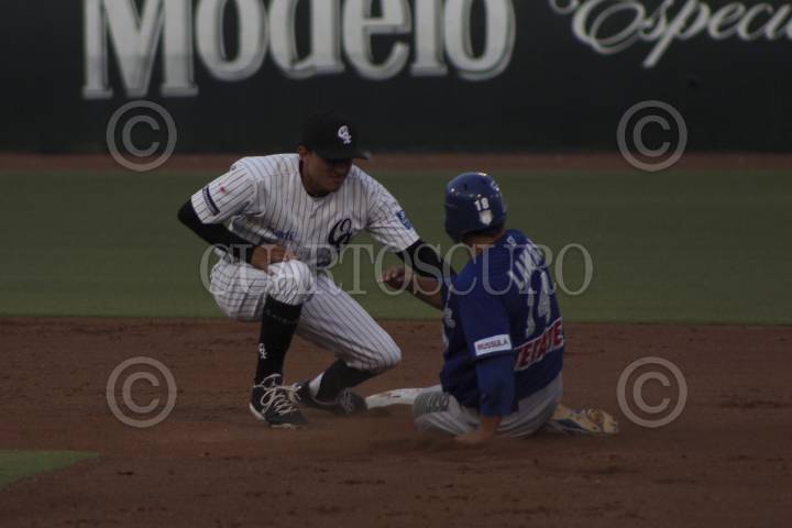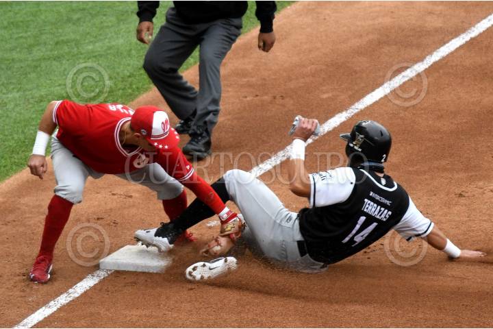 Terrazas, jugador de los Guerreros de Oaxaca, es sacado del campo luego de ser tocado por la tercera base.