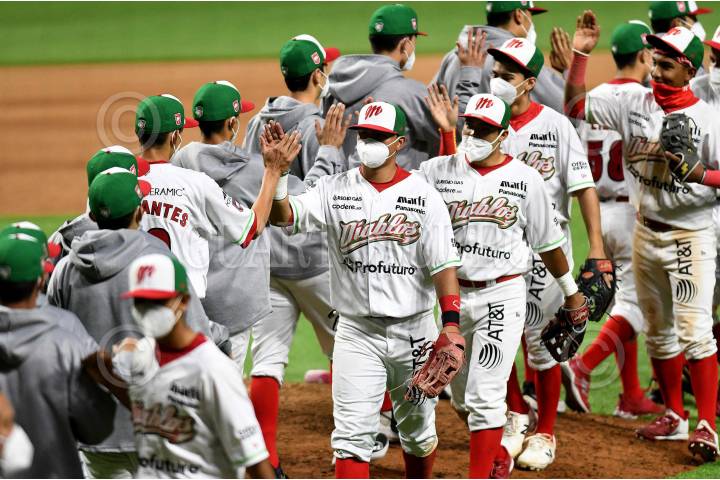 El pelotero Cristian Sanramaría festeja la victoria de los Diablos Rojos del México.