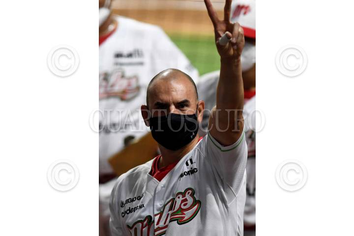 El pelotero Jorge Cantú festeja la victoria de los Diablos Rojos del México.