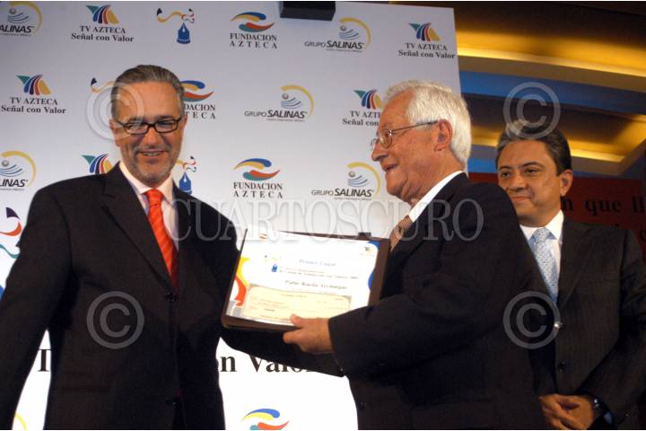 MÉXICO D.F. 25MAYO2006.- Ricardo Salinas Pliego, director del grupo Salinas, Pablo Rueda Arciniaga ganador del concurso y Mario San Ramón, director general de T.V. Azrteca, durante la entrega de los premios del "II Concurso de Hispanoamericano de Guión de Telenovela con Valores 2005" en un restaurante en el Bosque de Chapultepec. FOTO: Guillermo Perea/CUARTOSCURO.COM FOTO: Guillermo Perea/CUARTOSCURO.COM