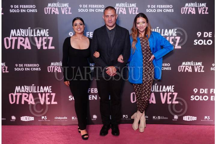 La actrices Paulina Gaitán y Regina Blandón, acompañadas de Guillermo Calderón, director de la película Maquíllame otra vez, durante la Alfombra Roja en Cinépolis Miyana