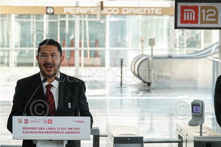 Martí Batres, jefe de Gobierno, durante su participación en la reapertura del tramo de las estaciones del metro Atlalilco a Periférico Oriente y viceversa de la Línea 12