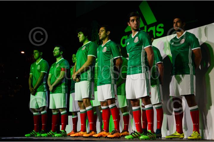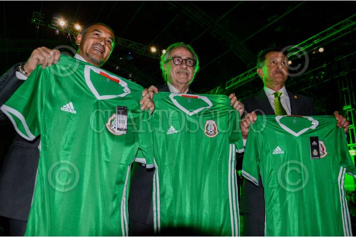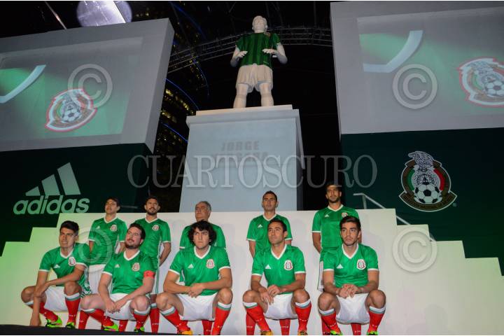 CIUDAD DE MÉXICO, 03MARZO2016.- La Federación Mexicana de Fútbol y la marca Adidas realizaron la presentación del nuevo uniforme de la selección mexicana de fútbol, el cual será estrenado el próximo 29 de marzo y utilizado durante el mundial de Rusia 2018. Al acto acudieron Decio de María, Presidente de la Federación Mexicana de Fútbol; Juan Carlos Osorio, Decio de María, Presidente de la Federación Mexicana de Fútbol, al igual que los jugadores Oribe Peralta, Paul Aguilar, Eduardo Herrera, Hirving Lozano, Luis Fuentes, Rodolfo Pizarro y Erick Gutiérrez. El templete fue instalado en la entrada de los Leones del Bosque de Chapultepec. FOTO: GALO CAÑAS /CUARTOSCURO.COM