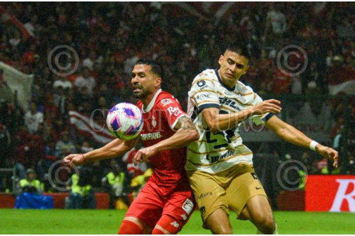 TOLUCA, ESTADO DE MÉXICO, 05OCTUBRE2024.- Luan García defensa de los Diablos de Toluca y Guillermo Martínez delantero de la escuadra universitaria de Pumas en el estadio Nemesio Diez, en el partido correspondiente a la jornada 11 del Torneo Apertura 2024, terminado el encuentro con un marcador 1-1. FOTO: CRISANTA ESPINOSA AGUILAR /CUARTOSCURO.COM