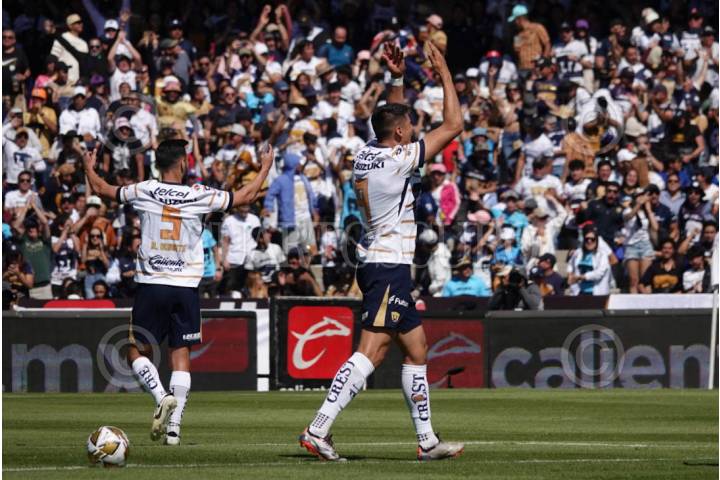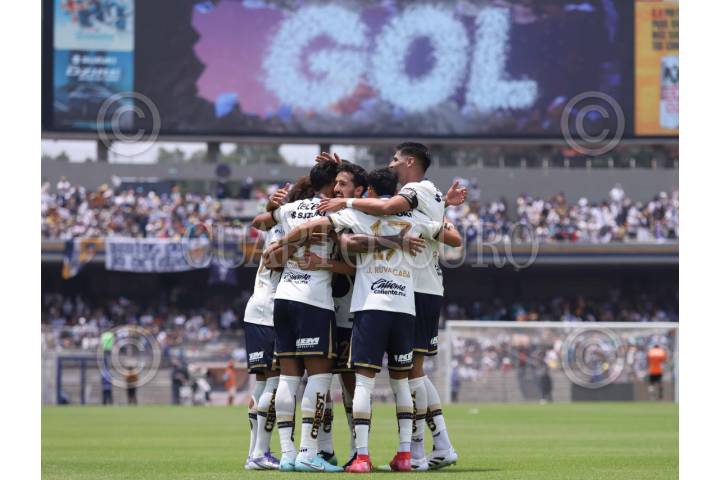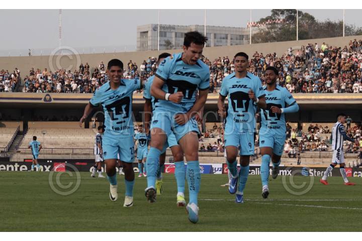 CIUDAD DE MÉXICO, 20OCTUBRE2024.- Jugadores del equipo de los Pumas celebraron el primero gol anotado a su favor contra San Luis durante la Jornada 12 de la Liga MX en el Estadio Olímpico Universitario. FOTO: GRACIELA LÓPEZ/CUARTOSCURO.COM