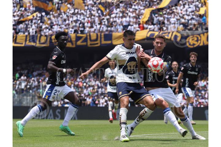 CIUDAD DE MÉXICO, 24AGOSTO2025.- José Pachuca, defensa central de Puebla, y Guillermo Martínez, delantero de Pumas, disputaron el balón durante el partido de la Jornada 6 de la Liga MX en el Estadio Olímpico Universitario, donde quedaron 0-0 en el marcador final. FOTO: GRACIELA LÓPEZ/CUARTOSCURO.COM
